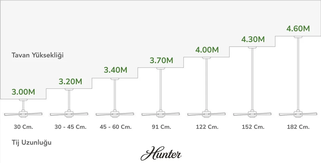 Hunter tavan vantilatörlerinin çoğunun içinden Türkiye standart tavanlarına uygun olarak (2.60-2.70M) 7 Cm. uzatma borusu çıkmaktadır. Uygulama yapılacak tavan 2.90M ve üzerindeyse ekstra uzatma borusu desteği gerekir. Bunun sebebi hem estetik görünüm hem maksimum performans alabilmektir.